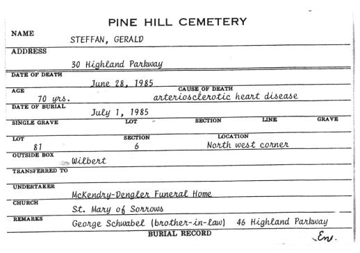 • Cemetery Plot Record: Dorothy (née Schwert) and Gerald M. Steffan, Lot 81, Section 6, United German & French Cemetery (Pine Hill), Cheektowaga, NY.