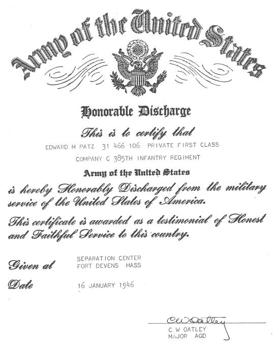 Edward's military records indicate that he attended public school in Boston, Masschusetts, completing coursework through the 9th Grade. On April 27, 1941, Edward married Geraldine Edith Marks. Geraldine was born in 1921 in Boston, Masschusetts. She was the daughter of Clifton S. Marks (native of Blue Hill, Maine) and Frances (née Oliver) Marks (native of Phippsburg, Maine). Up until 1942, when his daughter Frances was born, Edward worked as a bricklayer's laborer. He then became a bricklayer, in order to earn more money for his new family. Edward was inducted into the U.S. Army in 1944. During World War II, he served as a rifleman in Company C 385th Regiment, where he fought in Europe (battles and campaigns included Rhineland, Ardennes, and Central Europe). Edward was honorably discharged from military service on January 16, 1946. Frances (née Patz) Craig writes of her parents: After the war, Mom and Dad bought my grandmother's house at 143 Falcon Street in East Boston, where he lived for the rest of his life. He was very seriously burned in an accident in his back yard, lighting a charcoal grill, in 1970, and spent three months in the isolation burn unit at Massachusetts General Hospital, receiving several skin grafts, and several more months recuperating at home. He often joked about donating his body for an exhibit at the Smithsonian, because of the scarring on his trunk, arms and legs. He was not able to tolerate the chemicals used in bricklaying after that, so became a maintenance worker at Revere Memorial Hospital in 1971. He retired on disability in, I think, 1979, after his first heart bypass. He and Mom loved to camp and had a trailer in a campground in Rochester, NH. They also loved to travel, and took to spending their winters in Florida after they retired. He was always the life of every party, and had a large store of awful jokes. His greatest joy was his family, and he loved nothing more than holding his grandchildren and great-grandson in his lap and making them laugh. He had at least two heart attacks in 1986-7 and a second bypass in 1987, and suffered from congestive heart failure until his death in 1997. Edward died on September 20, 1997. He is interred in a plot adjacent to his parents at Woodlawn Cemetery, Everett, Massachusetts. The following is with reference to the award to Edward Martin Patz of the Combat Infantry Badge. This badge is usually awarded to a service man who faced personal combat/jeopardy in action during a war. The account is written by his daughter Frances (née Patz) Craig: "Dad was wounded by shrapnel (WW II), what he called a "Million Dollar Wound" in the shoulder. It didn't hit anything vital, but did cause stiffness enough to qualify him for a disabled vet abatement on his real estate taxes. (He knew about but never took advantage of that abatement until he was not able to work as a brickie any longer after his burn accident in 1970.) The Combat Infantry Award could have been for his service at the Battle of the Bulge? I know he fought there. I remember the scar quite well, a nasty looking puckered dent in the front of his shoulder and a surgical scar in the back where they removed the piece of shrapnel." This Military Service Record for Edward records both this badge, and his award of the Purple Heart medal. |