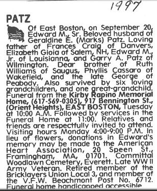 General location of the gravesite for Edward Martin Patz, Sr., Woodlawn Cemetery, Everett, Massachusetts. A map to the gravesite is available here.