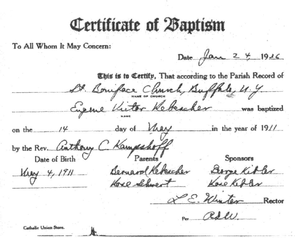 Eugene had the normal life of any young Catholic boy during his childhood. He worked from a young age with his father Bernard at the construction business that his father owned along with his older brothers. Eugene went to the Catholic school, as did all children of that time. At the age of 12, he decided to prepare for priesthood. Eugene had a wonderful sense of humor and was a real prankster. He always enjoyed a good laugh. He loved acting and was in the St. Mary Of Sorrow Church Drama Group presentation of "Who Wouldn’t Be Crazy;" while in high school. Upon graduating from high school, Eugene went to the Catholic University in Washington, D.C., to finish his studies and to prepare to become a priest in the Josephite Order. He had studied for this from the age of 12 to age 23. One year before being ordained into priesthood, Eugene met Miss Rose Brendel (also spelled Brendle or Brendl). At this time, he started to have doubts about becoming a priest after having invested 11 years of preparation.