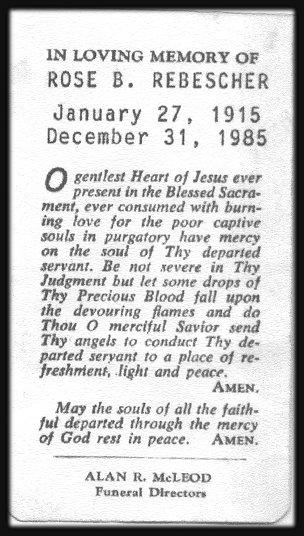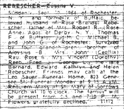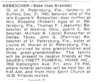 Eugene stayed in the family construction business until about 1947, when he moved his family to 1429 Burns Road, Derby, N.Y. At that time, he went to work for the Federal Portland Cement Company. While in Derby he raised Pedigree Golden Retrievers, and at one time he had nine of them. In 1957 Eugene moved his family back to the Buffalo area both because of his declining health and because they would be closer to the hospitals and family. He had several heart attacks by this time. The children would go with different family members while Eugene was in and out of the hospitals and recovering during his illness. The family lived on 89 Roehrer Street in the home that had been Rose’s parents, and Eugene worked in Rochester, N.Y., at a branch of the company he had worked for in Derby. It was called Rochester-Portland Cement Company, and Eugene was the Director of Technical Engineering in a facility the company had built so he could be closer to home and the hospitals. While working for them he would travel in the area giving seminars on the business. On Thursday, September 10, 1964, in Corning, N.Y., at the Corning Glass Company, as he was giving a seminar on concrete he suffered a moving embolism that went to his brain. He died instantly at the seminar. At the time Eugene's youngest child, John, was only 4 years old, and life became rough for Rose and the children. She purchased a house in West Seneca, NY, and rented out the upper half. But the tenants made it rough on Rose, and she had to ask them to move. At this time some of the children were grown and on their own. Louise (née Brendel) and Gay Moran, Rose’s sister and brother-in-law, offered for her and young John to move into their home, which they did. Rose was a very prim and proper lady. Never saying a bad word about others. She died on December 31, 1985, in Saint Petersburg, Pinellas County, Florida. Both Eugene and Rose are interred in Lot 22, Sec. 5, United German & French Cemetery (Pine Hill), Cheektowaga, NY. Text by Judith C. (née Rebescher) Glose, daughter of Eugene and Rose Rebescher. |