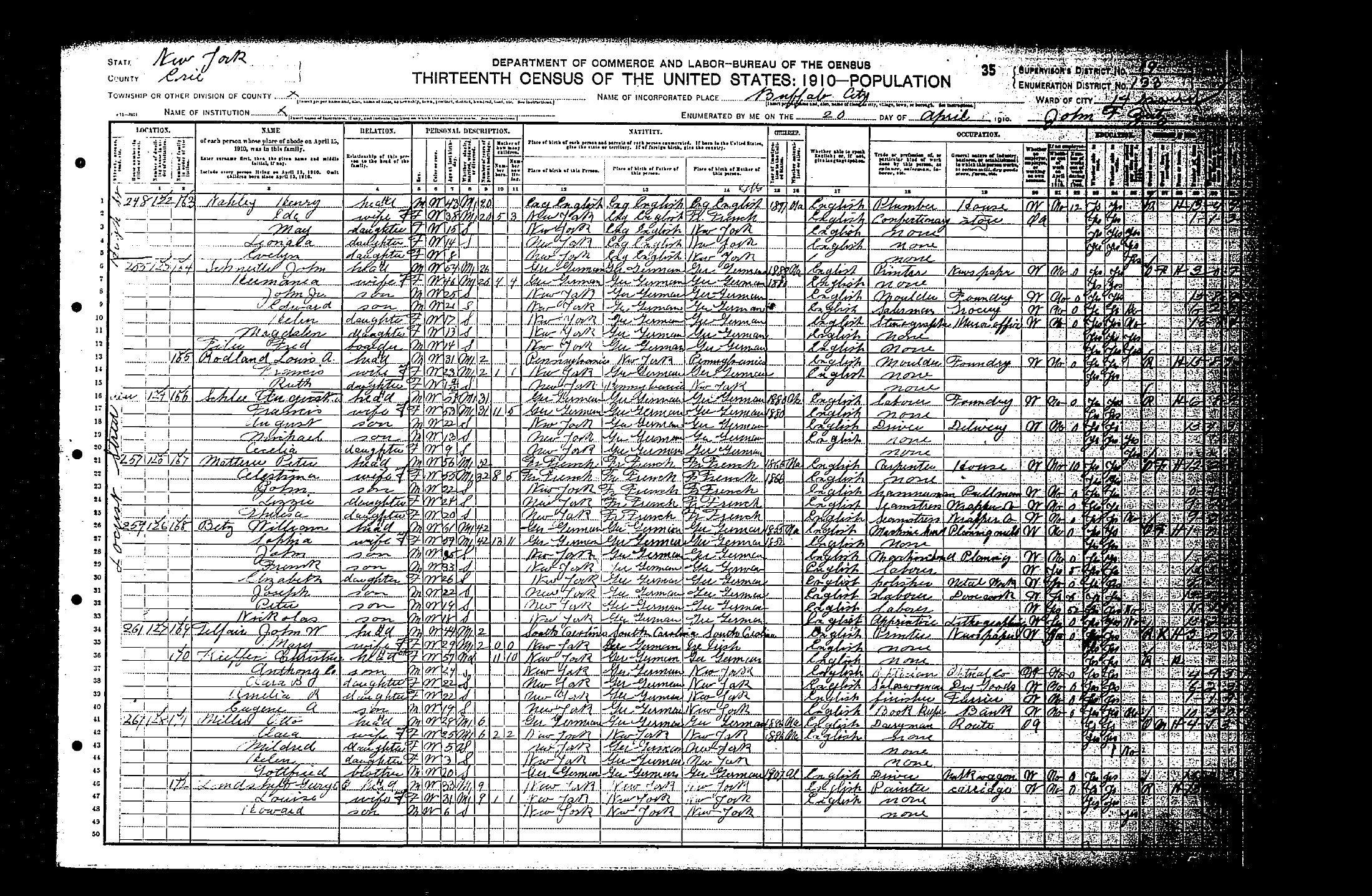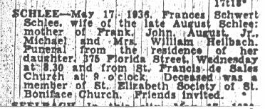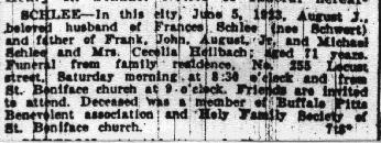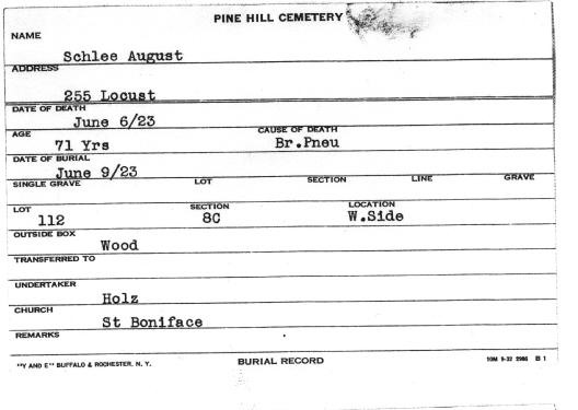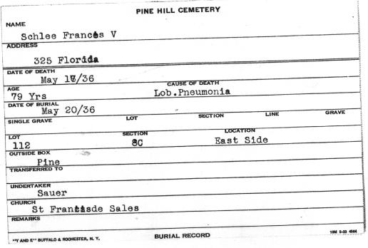 On May 12, 1878 at Kladau, West Prussia, Francisca married August J. Schlia. August was born in Lagschau on August 20, 1851. He was the son of Jacob and Anna (née Potrotz) Schlyia (note many variants for surname spellings of these families). The Catholic church ledgers of Kladau show that August was baptized as "August Michael Schlyia" on August 31, 1851. According to John Penberthy (son of Rita [née Schleer] Penberthy and great grandson of August and Francisca), August later in the Prussian army. He lost part of his hand or fingers in battle. On November 5, 1880 in Lagschau, Francisca gave birth to a daughter, Anna Susanna Schlia. With their infant daughter, Francisca and August emigrated to the United States. They departed Hamburg, Germany on March 25, 1881 aboard the S.S. Hamburg. The Hamburg departure records list them as: Traveling with them were Francisca's brother Franz (= "Frank") Carl Schwertfeger, his wife Julianne (= "Julia") (née Schlia) Schwertfeger (a sister to August) and their infant son Johann (= "John"). At Liverpool, England, both familes transferred to the S.S. Canada, arriving in New York City on April 13, 1881. A mis-transcribed passenger manifest lists the Schlias as follows: The same passenger manifest also mistakenly lists the Schwertfegers as "Schwerfegor." The two families settled in Buffalo, New York --- in a German neighborhood known as "The Fruitbelt" due to several of its streets being named after fruit trees. Francisca and August anglicized their names: Francisca became "Frances (née Schwert) Schlee." August became "August J. Schlee." Labels on a photograph imply that yet another sibling, "Mary" Schlia / Schlee, emigrated to the United States; however records of the marriage (June 25, 1890, St. Boniface R.C. Church, Buffalo) of Mary to Bernhart (= "Bernhard") Potratz demonstrate that the maiden name of Mary's mother was "Koschmieder," while the maiden name of the mother for August and Julianna was "Potrotzka." Thus Mary was likely not a direct sibling of August and Julianna. (See further information, below). According to the Buffalo City Directory, August and Francisca resided in 1890 at 248 High Street (white building) -- apparently next door to Johann (John) and Maria (Mary) (née Schwertfeger) Patzke/Patz), who resided at 250 High Street. During their later years, August and Francisca resided at 255 Locust Street (now a vacant lot) in Buffalo, New York. They raised six children. Despite the implications of the 1900 Census, where it states that four of the four existing children still survived, there is an 1895 baptismal record for Jacob Michaëlew Schlia -- apparently a child who did not survive until the 1900 census. August died of pneumonia on June 5, 1923, at the age of 71 (the cemetery records state that he died on June 6th). Francisca died of pneumonia on May 17, 1936, at the age of 79. At the time of her death, she resided at 375 Florida Street in Buffalo (the street address on her interment record is in error). Both Francisca and August are interred in Lot 112, Sec. 8C, United German & French Cemetery (Pine Hill) in Cheektowaga, NY.