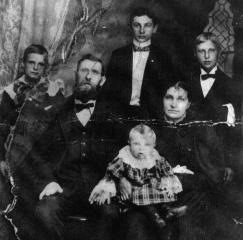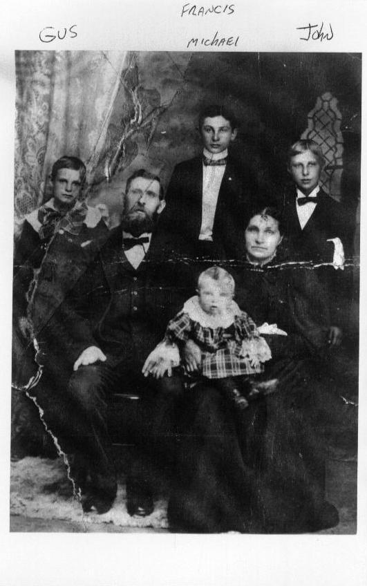 Family portrait of August and Francisca (née Schwertfeger) Schlia / Schlee, probably taken about 1898 in Buffalo, New York. Seated are August and Francisca. On Francisca's lap is Michael. Standing, left-to-right: August ("Gus"), Jr., Francis ("Frank"), and John.