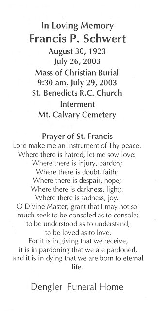 This web site on Francis Paul Schwert is under development. We welcome your input, stories, photographs, documents, and other resources. |