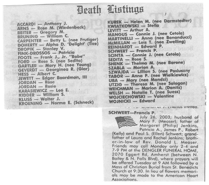 | Francis Paul Schwert was born in Buffalo, NY, on August 30, 1923. He attended Blessed Trinity School and Seneca Vocational High School. Fran served in the U.S. Navy during World War II as an electrician's mate second class on the USS Yosemite, a destroyer tender.
