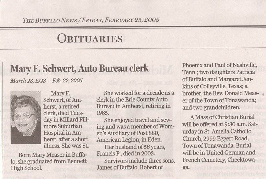 Following the war, Fran married Mary Frances Measer, daughter of Stephen and Hazel Measer. For 40 years, Fran was an electrician at Greater Buffalo Press, retiring in 1986. Fran enjoyed collecting stamps, watching baseball, and playing golf. Francis died on July 26, 2003, at the age of 79. Mary died on February 22, 2005, at the age of 81. Both are interred in Lot 114, Section 20, United German & French Cemetery (Pine Hill), Cheektowaga, NY. |