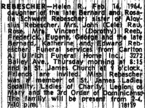 | Helen Rose Rebescher was born on August 9, 1899, in Buffalo, New York. She was baptized by Fr. Ferdinand Kolb of Saint Boniface R.C. Church, 124 Locust Street, Buffalo, on August 13, 1899. Her sponsors were Franz (= "Frank") and Julia (née Schlia / Schlee) Schwertfeger / Schwert.
