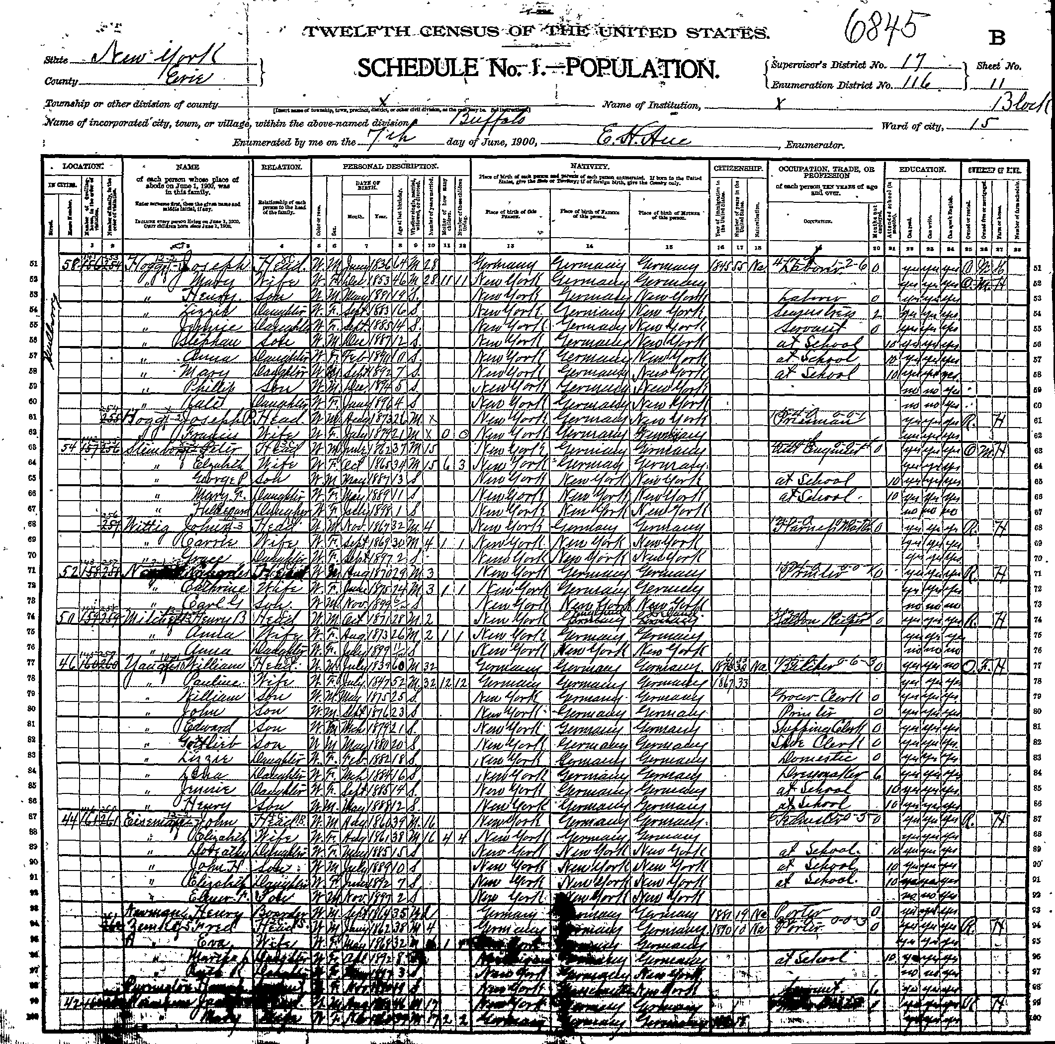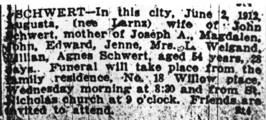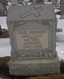 In early 1882, we know that Johann was residing with his parents in the tiny manorial village of Lagschau, Kr. Danziger Höhe, West Prussia. Johann departed to join his siblings Franz and Francisca (née Schwertfeger) Schlia in the industrial city of Buffalo, New York. Johann first traveled to Hamburg, Germany, where he then boarded the steamship India on April 5, 1882. After his arrival in Buffalo, Johann Americanized his name to "John Schwert." On April 10, 1883, Johann married Augusta (probably originally Auguste) Lorenz at Saint Boniface R.C. Church, 124 Locust Street, in Buffalo. Augusta was the daughter of August and Julianna (née Malinowska) Lorenz from the tiny settlement of Klopschau, located south of Katzke, West Prussia. According to the 1900 U.S. Census, Augusta was born in May, 1858. After their marriage, the couple resided at 18 Willow Place in Buffalo. Johann and Augusta had at least three sons and six daughters. The 1890 City Directory for Buffalo gives Johann's profession as being a "laborer." The 1928 City Directory lists his profession as being an "elevator operator." Records provided by Geri Ellerbrock present the following on Johann's U.S. citizenship status: Augusta died on June 2, 1912, at the age of 54 years, 24 days, of complications due to gallstones (cholecystitis). Johann married Carrie (née Wright) Wittig, born in 1869. He became foster-father to her daughter, Grace. According to the 1900 Census, Carrie had been the wife of John Wittig; the Wittig family had resided at 54 Mulberry Street in Buffalo. Johann died on January 8, 1938. He is interred with Augusta in Lot 428, Section VV, United German & French Cemetery (Pine Hill), Cheektowaga, NY. Carrie Schwert-Wittig died at the age of 94 on August 30, 1964, of myocardial infarction. Carrie is interred with her daughter Grace M. (née Wittig) Acquard and Grace's husband Clarence W. Acquard (1890-1964) in Lot 339, Section I, Mount Calvary Cemetery (Pine Hill), Cheektowaga, NY.