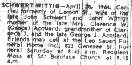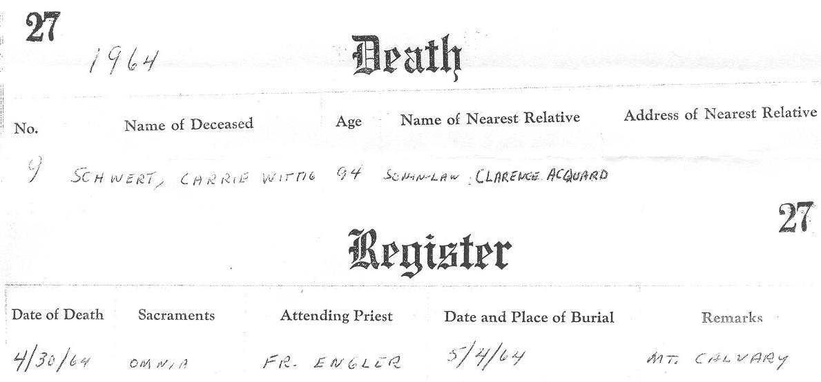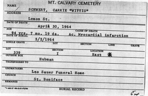 | Grave of Carrie Wittig-Schwert, Lot 339, Section I, Mount Calvary Cemetery (Pine Hill), Cheektowaga, NY.
