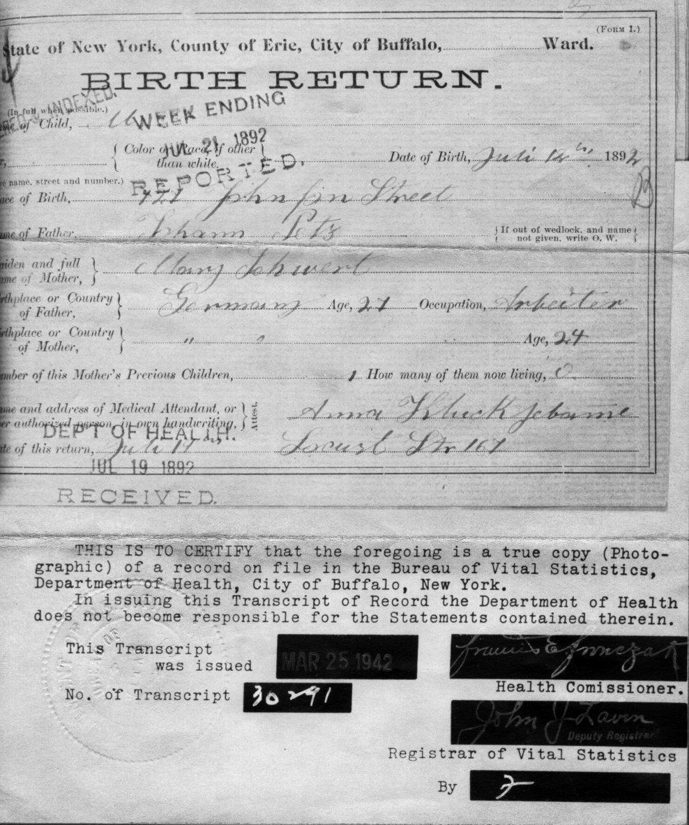 I don't know anything about the education of my grandparents or about any employment for my grandmother, Clara. I'm pretty sure she didn't work after she was married. My grandfather John served in the US Army during World War I, then went home with his bride to Buffalo. That didn't work out, so he brought her home to East Boston -- to an apartment, I think, just around the corner from her parents.