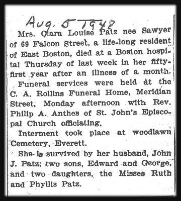 The following is paraphrased from the memories of Frances (née Patz) Craig, daughter of Edward Martin Patz, Sr., and granddaughter of John Joseph and Clara Louise (née Sawyer) Patz.