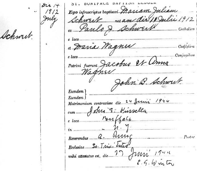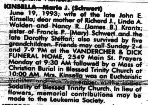 Marie went to Mount Saint Joseph's High school in Buffalo (her uncle, Rev. John Schwert, paid her way). On June 24, 1944, Marie married John E. Kinsella. John died on September 2, 1975. Marie died on July 19, 1993. They are interred in the St Anne de Beaupre section of Mount Olivet Cemetery, Kenmore, NY. |
